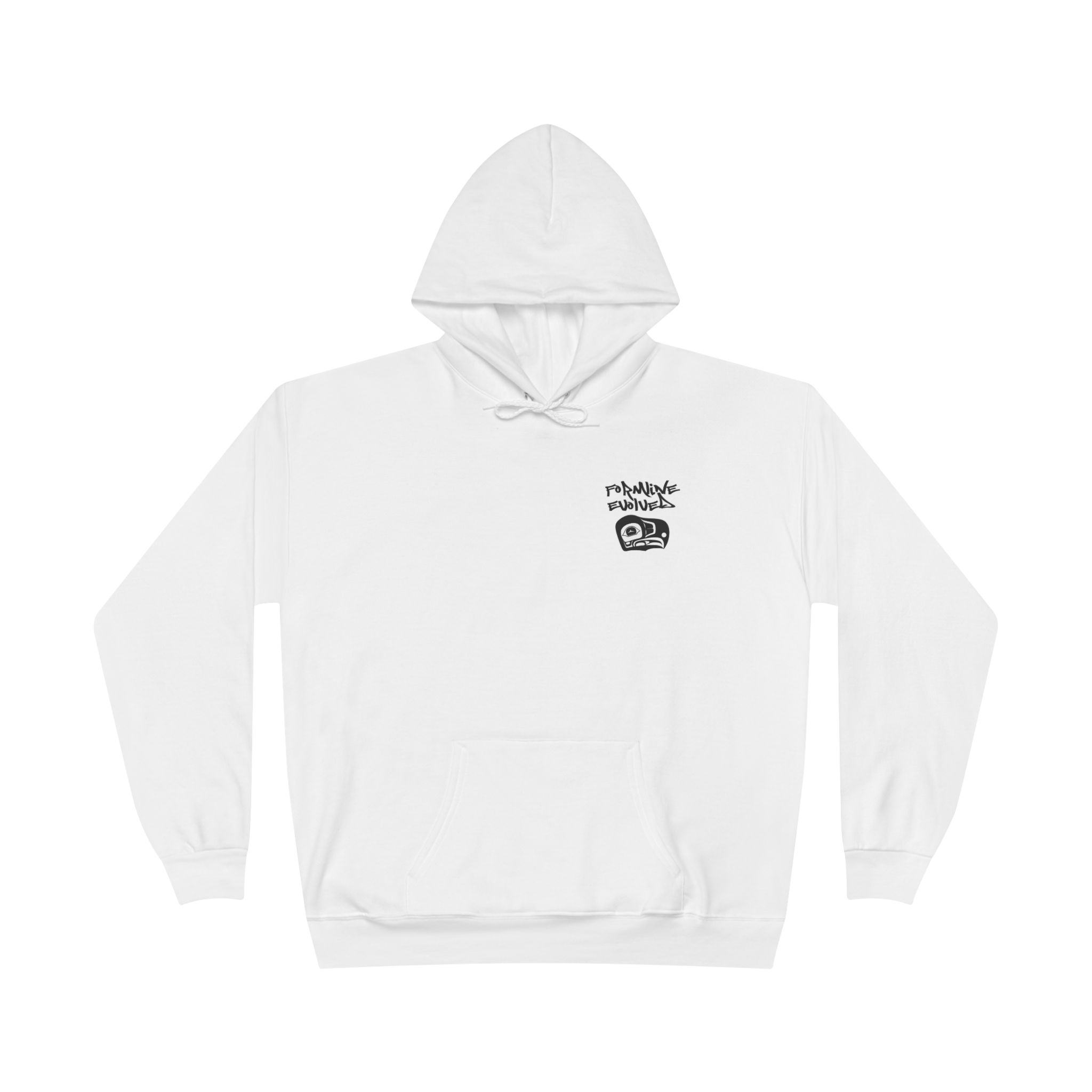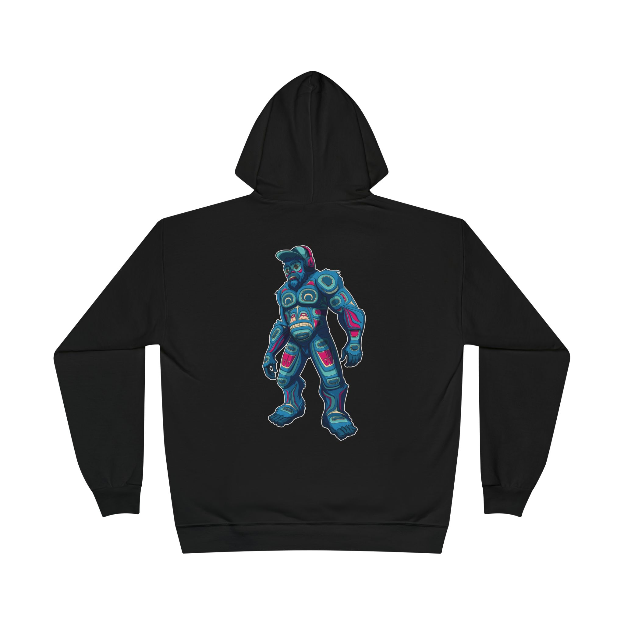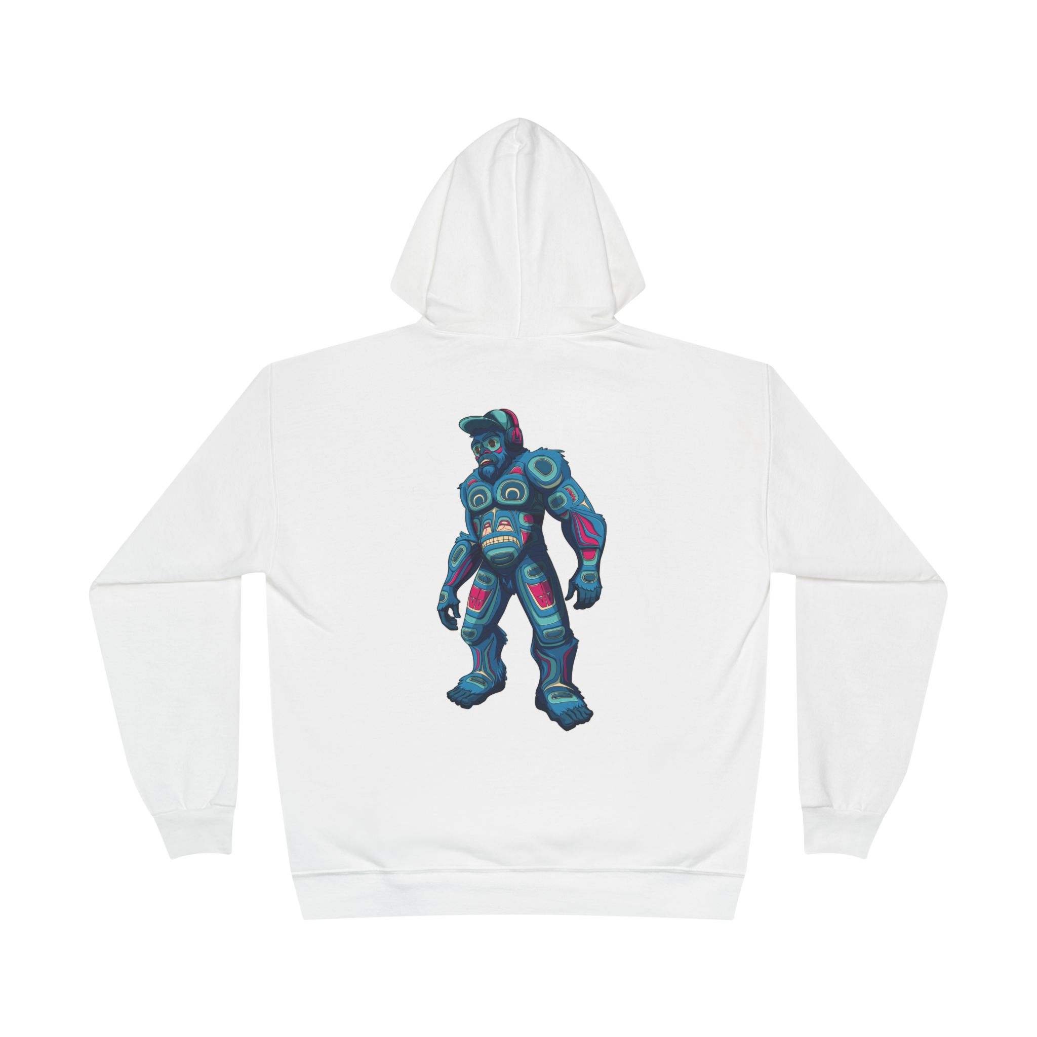 Soft, midweight hoodie with a clean front accent and a bold, colorful back design with a Tlingit Sasquatch in carved cartoon formline from “Urban Spirit” artwork. The roomy kangaroo pocket and fleece-lined interior create a cozy layer for cool mornings or late-night walks. Subtle eco-conscious details — like recycled polyester content and tubular knit construction — give this sweatshirt a lived-in feel without sacrificing structure. The front features a small, hand-drawn cassette graphic near the chest; the back shows a stylized, neon-toned fox mask with dripping paint effects, adding a modern, street-art edge. Wear it to layering gigs, chill sessions with friends, or whenever you want an effortless statement piece that feels personal and slightly rebellious.