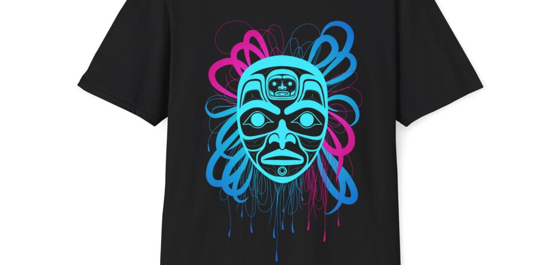 Shaman Mask: Mystic Weave – Neon Unisex T-Shirt, Tlingit and Haida totem design by Native American artist Wéidaaká Yóodóohaa